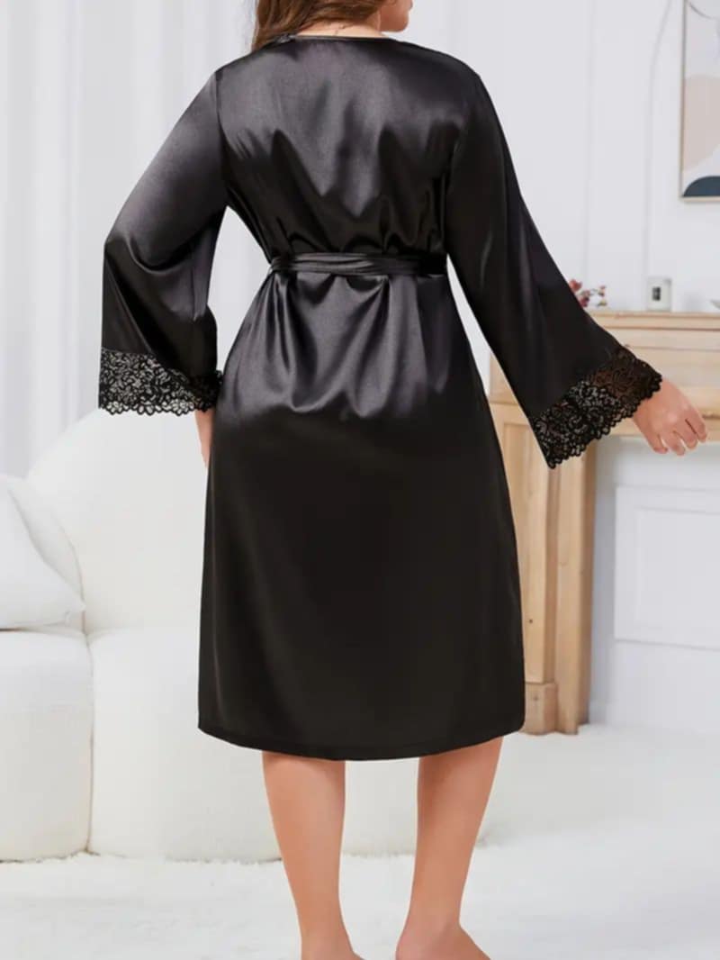 Ogrtač krasi duboki V izrez ukrašen finom čipkom koja nežno prati liniju dekoltea, dodajući dozu romantike i zavodljivosti. Satenski materijal meko pada niz telo, dok pojas u struku omogućava prilagođavanje i naglašavanje figure. Rukavi se završavaju čipkastim detaljima, koji dodaju dodatnu dozu sofisticiranosti.