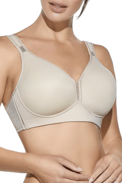 Njegova formirana D korpa sa žicom savršeno obuhvata i podiže grudi, pružajući izuzetnu potporu bez kompromisa po pitanju udobnosti. Korpa je povezana sa širokim, udobnim bretelama, koje ravnomerno raspoređuju pritisak i sprečavaju bol u ramenima, što ga čini idealnim za duže nošenje.