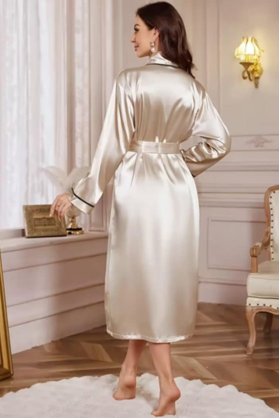 Uživajte u dodiru luksuza uz dugi ženski satenski ogrtač 25117, dizajniran da pruži osećaj glamura, topline i ženstvene samouverenosti. U nežnoj krem nijansi kao na slici, ovaj ogrtač odiše mirnom elegancijom, dok crna paspul traka elegantno ističe liniju dekoltea i rukava, stvarajući suptilan kontrast koji naglašava sofisticiran izgled.