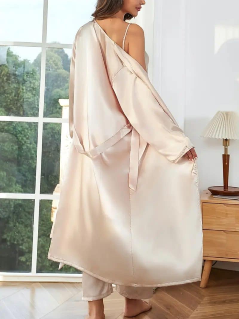 Uroni u svet elegancije i nežnosti uz satenski komplet za spavanje 252038. Ovaj luksuzni set u boji krem sastoji se od tri dela – satenskih pantalona, majice na tanke, podesive bretelice i laganog ogrtača koji celom izgledu daje notu prefinjenosti.