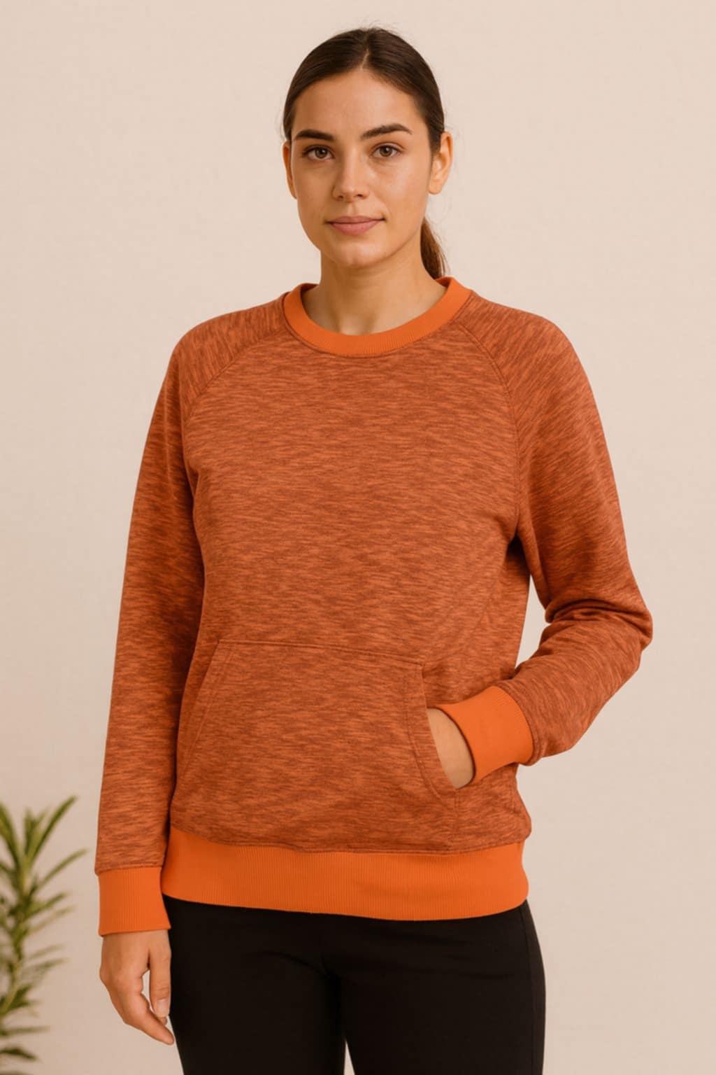 *Ženski pamučni duks – narandžasti melanž sa bočnim džepovima* Topao i udoban ženski duks izrađen od debljeg pamučnog materijala, savršen za hladnije dane i ležerne kombinacije. Model ima *duge rukave*, *okrugli izrez oko vrata* i praktične *bočne džepove ravno sečene*. Boja je *narandžasta melanž* sa detaljima u jednobojnoj narandžastoj nijansi na ranflama i oko izreza, što daje moderan sportski izgled. Kroj je klasičan i ravan, a materijal prijatan i mekan na dodir, idealan za svakodnevno nošenje i kombinovanje uz crne pantalone, farmerke ili helanke. *Karakteristike:* * Materijal: pamuk – deblji i topao * Boja: narandžasta melanž * Dugi rukavi i okrugli izrez * Bočni džepovi ravnog kroja * Ranfle na rukavima i dnu za bolje prijanjanje Praktičan, topao i moderan duks – odličan izbor za svakodnevne aktivnosti i udobnost tokom hladnijih dana.