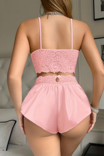 U kompletu se nalaze i gaćice koje su u struku ukrašene čipkom, pružajući skladan i zavodljiv izgled celog seta. Kroj je prilagođen tako da lepo stoji na različitim tipovima građe, dok materijali obezbeđuju prijatan osećaj na koži.